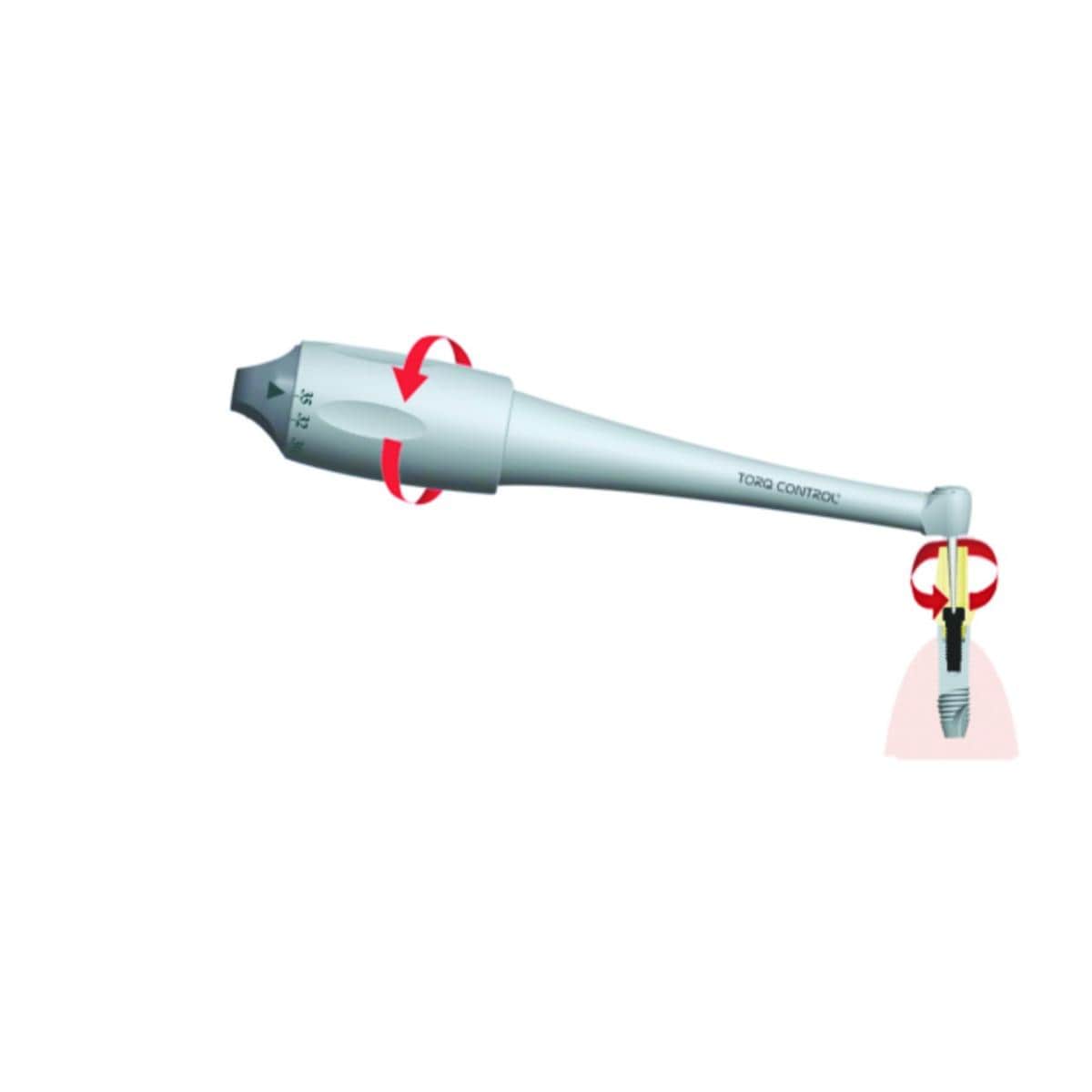 La précision du vissage de l'élément prothétique sur implant est primordiale pour la réussite du traitement implantaire. La mise en tension idéale de la vis permet de se prémunir de tout risque de dévissage. De la même façon, un couple de serrage trop important pourrait entrainer une fracture de la vis. Un vissage calibré ne peut être garanti que par l'usage d'un instrument de précision, muni d'un réglage de couple. La clé dynamométrique manuelle débrayable *Torq Control® répond parfaitement à ces contraintes. Compatible avec tous les systèmes d'implants, extrême précision de serrage grâce à 7 niveaux de couple débrayables (10/15/20/25/30/32 et 35 N.cm). Débrayage automatique pour une sécurité optimale. Seulement 135 gr pour une meilleure liberté de mouvement. Micro-tête pour un accès en bouche facilité. Angulation optimale de 100° de la tête pour faciliter l'accès aux secteurs postérieurs. Facilité d'entretien : conception monobloc avec une surface lisse limitant les zones de rétention bactérienne.